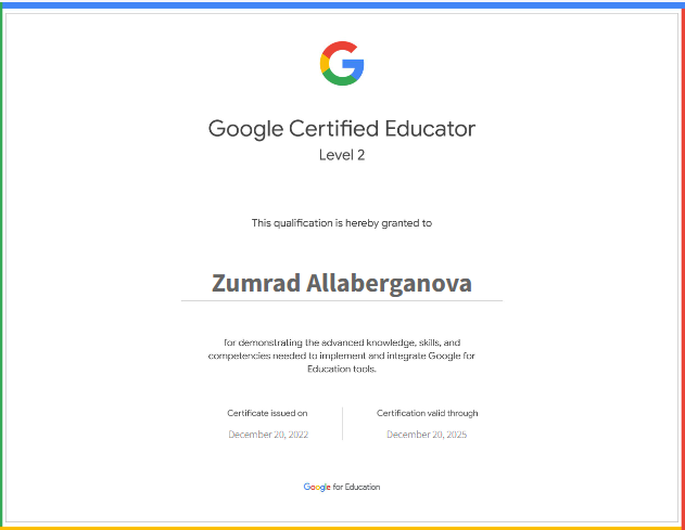 👉 Yuqoridagi farmonga asosan Allaberganova Zumrad Rajabovna va Abdullayeva Hilola Sharifboyevna GOOGLE FOR EDUCATION o‘quv kursi mashg‘ulotlarida faol qatnashib o‘quv kursini yakunlagani haqidagi sertifikatlarni qo‘lga kiritishdi.