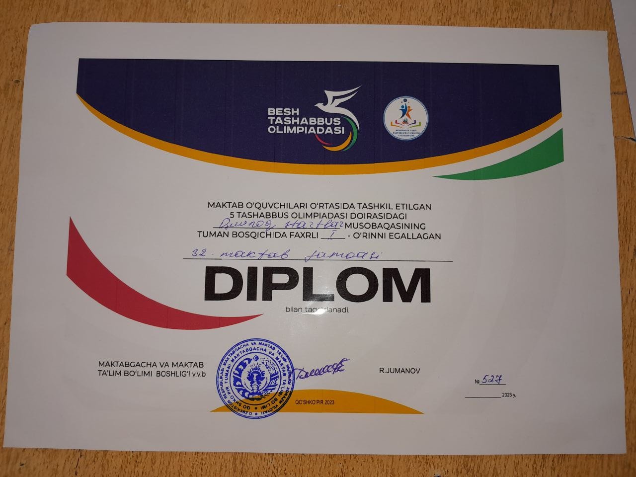 Maktab o'quvchilari o'rtasida tashkil etilgan "5 tashabbus" olimpiadasi doirasidagi quvnoq startlar musobaqasining Tuman bosqichida 32-maktab jamoasi faxrli I o'rinni egalladi.